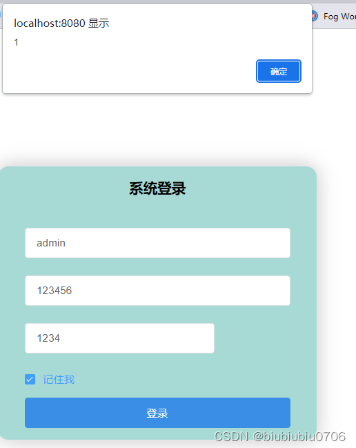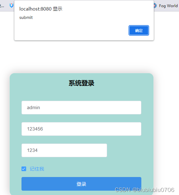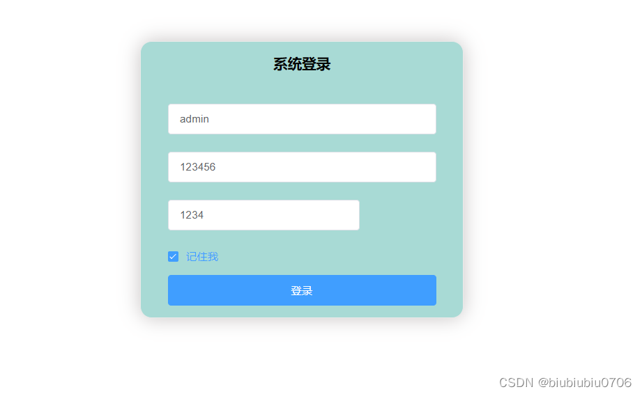 <template> <div> <el-form :ref="form" :model="loginForm"> <h3>系統登錄</h3> <!-- auto-complete="false"自動補全 --> <el-form-item label=""> <el-input type="text" auto-complete="false" v-model="loginForm.username" placeholder="請輸入用戶名"></el-input> </el-form-item> <el-form-item label=""><el-input type="text" auto-complete="false" v-model="loginForm.password" placeholder="請輸入密碼"></el-input> </el-form-item> <el-form-item label=""><el-input type="text" auto-complete="false" v-model="loginForm.code" placeholder="點擊圖片更換驗證碼"></el-input><img :src="captchaUrl"/> </el-form-item> <el-checkbox v-model="checked">記住我</el-checkbox> <el-button type="primary">登錄</el-button> </el-form> </div></template> <script>export default { name:"Login", data(){return{ captchaUrl:"",//驗證碼圖片鏈接 loginForm:{username:"admin",password:"123456",code:"1234" }, checked:true} } }</script> <style> .loginContainer{border-radius: 15px;background-clip: padding-box;margin:180px auto;width:350px;padding: 15px 35px 15px 35px;background: #a8dad5;border:1px solid #eaeaea;box-shadow: 0 0 25px #cac6c6; } .loginTitle{margin: 0px auto 40px auto;text-align: center; } .loginRemeber{text-align: left;margin:0px 0px 15px 0px; }</style>