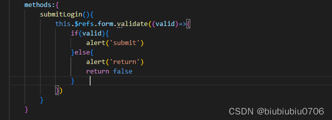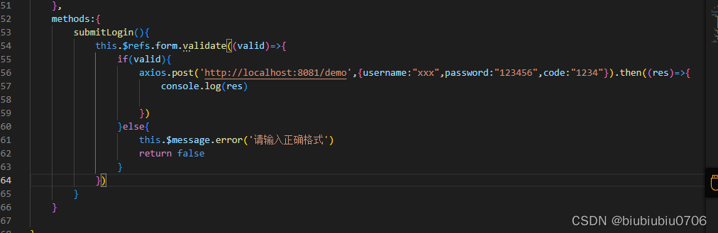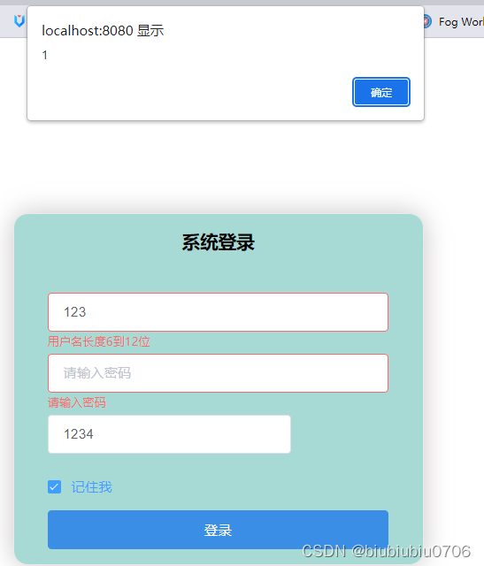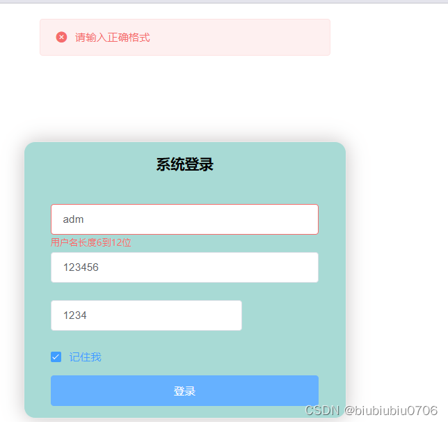<template> <div> <el-form :rules="rules" ref="form" :model="loginForm"> <h3>系統登錄</h3> <!-- auto-complete="false"自動補全 --> <el-form-item prop="username"> <el-input type="text" auto-complete="false" v-model="loginForm.username" placeholder="請輸入用戶名"></el-input> </el-form-item> <el-form-item prop="password"><el-input type="text" auto-complete="false" v-model="loginForm.password" placeholder="請輸入密碼"></el-input> </el-form-item> <el-form-item prop="code"><el-input type="text" auto-complete="false" v-model="loginForm.code" placeholder="點擊圖片更換驗證碼"></el-input><img :src="captchaUrl"/> </el-form-item> <el-checkbox v-model="checked">記住我</el-checkbox> <el-button type="primary" @click="submitLogin">登錄</el-button> </el-form> </div></template> <script>import axios from "axios"export default { name:"Login", data(){return{ captchaUrl:"",//驗證碼圖片鏈接 loginForm:{username:"admin",password:"123456",code:"1234" }, checked:true, rules:{username:[ {required:true,message:"請輸入用戶名",trigger:"blur"}, {min:5,max:12,message:"用戶名長度6到12位",trigger:"blur"}],password:[ {required:true,message:"請輸入密碼",trigger:"blur"}, {min:6,max:12,message:"密碼長度6到12位",trigger:"blur"}],code:[ {required:true,message:"請輸入驗證碼",trigger:"blur"}, {min:4,max:4,message:"驗證碼長度4位",trigger:"blur"}], }} }, methods:{submitLogin(){ this.$refs.form.validate((valid)=>{if(valid){ axios.post("http://localhost:8081/demo",{username:"xxx",password:"123456",code:"1234"}).then((res)=>{console.log(res) })}else{ this.$message.error("請輸入正確格式") return false} })} } }</script> <style> .loginContainer{border-radius: 15px;background-clip: padding-box;margin:180px auto;width:350px;padding: 15px 35px 15px 35px;background: #a8dad5;border:1px solid #eaeaea;box-shadow: 0 0 25px #cac6c6; } .loginTitle{margin: 0px auto 40px auto;text-align: center; } .loginRemeber{text-align: left;margin:0px 0px 15px 0px; }</style>總結