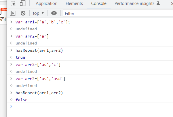 function hasRepeat(arr1,arr2){ if(arr1.length===0){return false; } if(arr2.length===0){return false; } var flag = false; for(var i=0;i<arr1.length;i++){if(arr2.indexOf(arr1[i]) >= 0){ flag=true; break;} } return flag;}測試: