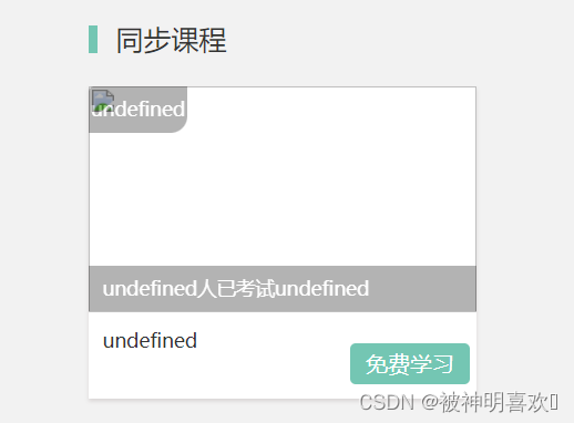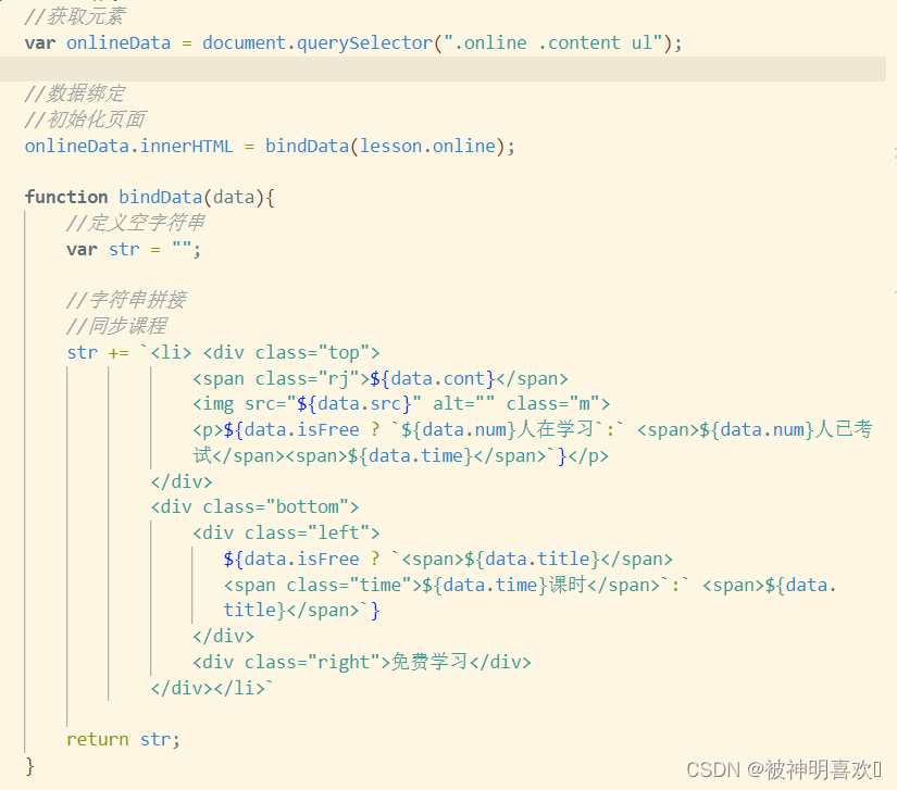 function bindData(data){console.log(data)//定義空字符串var str = '';//字符串拼接//同步課程str += `<li> <div class='top'> <span class='rj'>${data.cont}</span> <img src='https://www.jb51.net/javascript/${data.src}' class='m'> <p>${data.isFree ? `${data.num}人在學習`:` <span>${data.num}人已考試</span><span>${data.time}</span>`}</p></div><div class='bottom'> <div class='left'> ${data.isFree ? `<span>${data.title}</span> <span class='time'>${data.time}課時</span>`:` <span>${data.title}</span>`} </div> <div class='right'>免費學習</div></div></li>`return str; }lesson.online數據為: