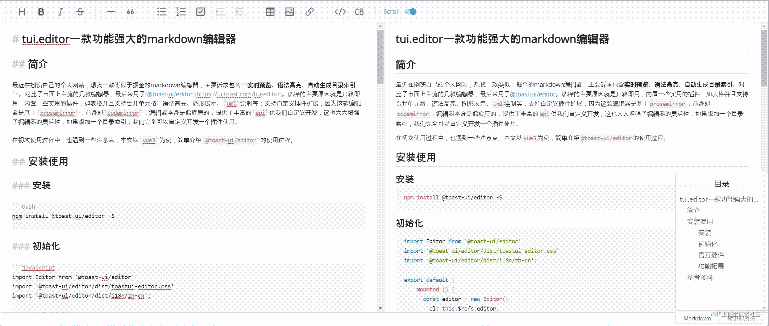 最近在捯飭自己的個人網站,想找一款類似于掘金的markdown編輯器,主要訴求包含實時預覽、語法高亮、自動生成目錄索引。對比了市面上主流的幾款編輯器,最后采用了@toast-ui/editor。選擇的主要原因就是開箱即用,內置一些實用的插件,如表格并且支持合并單元格、語法高亮、圖形展示、uml繪制等;支持自定義插件擴展,因為這款編輯器是基于prosemirror,前身即codemirror,編輯器本身是偏底層的,提供了豐富的api供我們自定義開發(fā),這也大大增強了編輯器的靈活性,如果想加一個目錄索引,我們完全可以自定義開發(fā)一個插件使用。