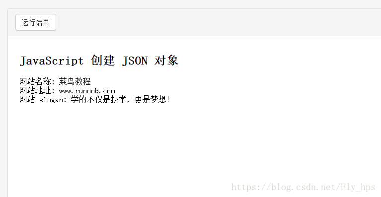 <!DOCTYPE html><html><head><meta charset='utf-8'><title>菜鳥教程(runoob.com)</title></head><body><h2>JavaScript 創(chuàng)建 JSON 對象</h2><p>網(wǎng)站名稱: <span id='jname'></span><br /> 網(wǎng)站地址: <span id='jurl'></span><br /> 網(wǎng)站 slogan: <span id='jslogan'></span><br /> </p><script>var JSONObject= { 'name':'菜鳥教程', 'url':'www.runoob.com', 'slogan':'學(xué)的不僅是技術(shù),更是夢想!'};document.getElementById('jname').innerHTML=JSONObject.name document.getElementById('jurl').innerHTML=JSONObject.url document.getElementById('jslogan').innerHTML=JSONObject.slogan</script></body></html>