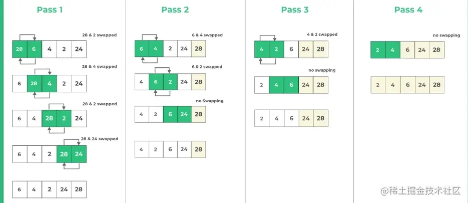 - 每輪比較結束后,需要排序的元素數量減一,直到沒有需要排序的元素。
