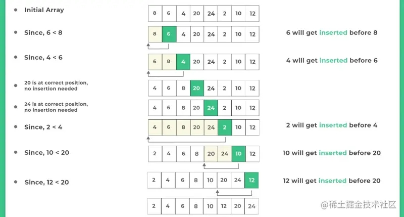 - 如果當(dāng)前元素小于前面的有序數(shù)組元素,則把當(dāng)前元素插入到前面的合適位置。