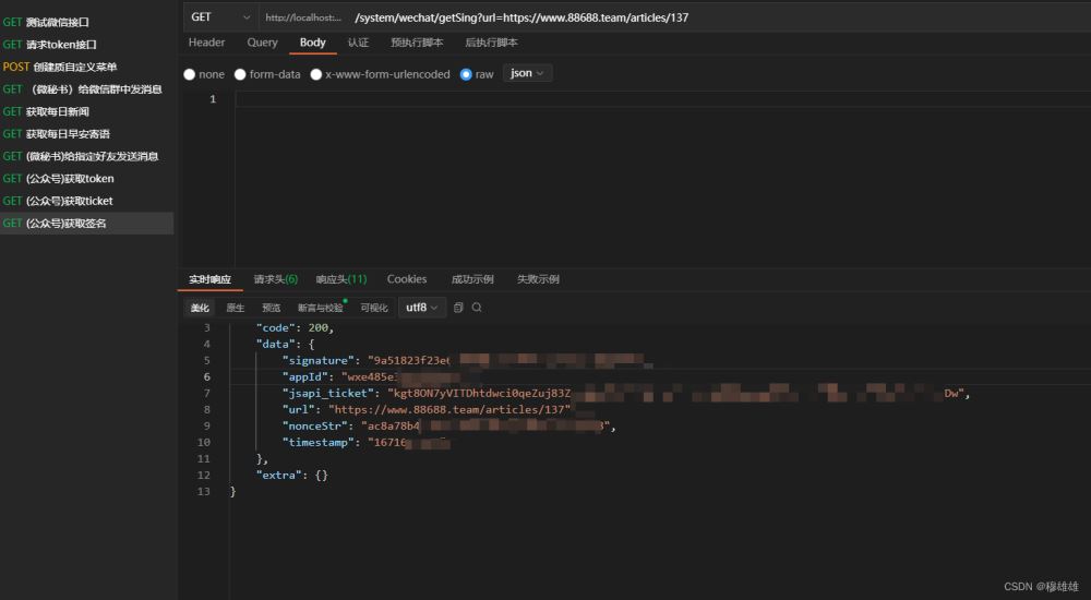 /** * 獲取jsapi_ticket * @return */ @GetMapping("/getJsapiTicket") public String getJsapiTicket() {//獲取redis里面的tokenObject access_token = redisService.getCacheObject("gzh_access_token");if (access_token==null) { access_token = getToken();}String path = "ticket/getticket?access_token=" + access_token.toString() + "&type=jsapi";String body = HttpUtil.createGet(WX_GZH_API + path).execute().body();log.info("獲取了JsapiTicket,返回數(shù)據(jù)" + body);JSONObject object = JSON.parseObject(body);//獲取ticketString ticket = object.getString("ticket");//錯誤碼Integer errcode = object.getInteger("errcode");if(errcode==0){ //將ticket值的值放在redis里面 redisService.setCacheObject("gzh_ticket", ticket,7190,TimeUnit.SECONDS);}return ticket; }這兩個方法我都寫了緩存,和是失效時間,并且在用的時候都會去判斷緩存里面有沒有值,沒有的話,我們再去請求重新獲取,而不是每次都請求獲取,這樣會造成接口請求頻繁受到限制的問題。