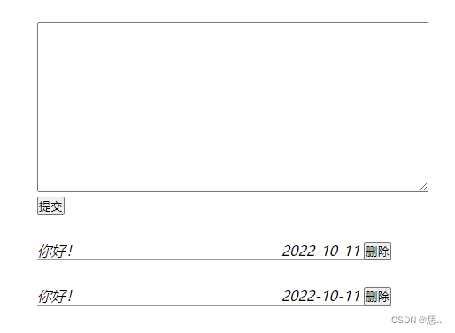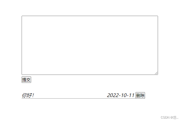 var allB = document.querySelectorAll('button'); for (var i = 0; i < allB.length; i++) {allB[i].onclick = function () { list.removeChild(this.parentNode.parentNode);}5.全部代碼<!DOCTYPE html><html lang='en'><head> <meta charset='UTF-8'> <meta http-equiv='X-UA-Compatible' content='IE=edge'> <meta name='viewport' content='width=device-width, initial-scale=1.0'> <title>Document</title></head><style> * {margin: 0;padding: 0; } #mgs {width: 400px;color: black;font-style: italic;border-width: 5px;margin: 0 auto; } #text {width: 400px;height: 150px;padding: 20px;font-size: 20px; } li {list-style: none;border-bottom: 1px solid #999;line-height: 20px;margin-top: 30px; } span {float: right; }</style><body> <div id='mgs'><textarea id='text'></textarea><br><input type='button' value='提交'><ul class='list'></ul> </div><script> var btn = document.getElementById('btn'); var list = document.querySelector('.list'); var text = document.getElementById('text'); btn.onclick = function () {if (text.value == '') { alert('你沒有輸入內容。')} else { var li = document.createElement('li'); var time = new Date(); var mytime = time.getFullYear() + '-' + (time.getMonth() + 1) + '-' + time.getDate(); li.innerHTML = text.value + '<span>' + mytime + '\t' + '<button>刪除</button></span>'; text.value = ''; list.insertBefore(li, list.children[0]); var allB = document.querySelectorAll('button'); for (var i = 0; i < allB.length; i++) {allB[i].onclick = function () { list.removeChild(this.parentNode.parentNode);} }} }</script></body></html>6.效果圖:沒有輸入內容時: