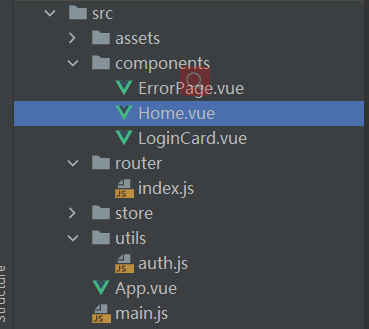 ?<template> <div> <h1>主頁面</h1> <el-button @click="logout">退出登錄</el-button> </div></template><script>import * as auth from "../utils/auth"export default { name : "Home", data() { return { }; }, methods: { logout(){ auth.removeAdminInfo(); this.$router.push({path:"/loginCard"}); } }, mounted() { }}</script>基本目錄結構是這樣的