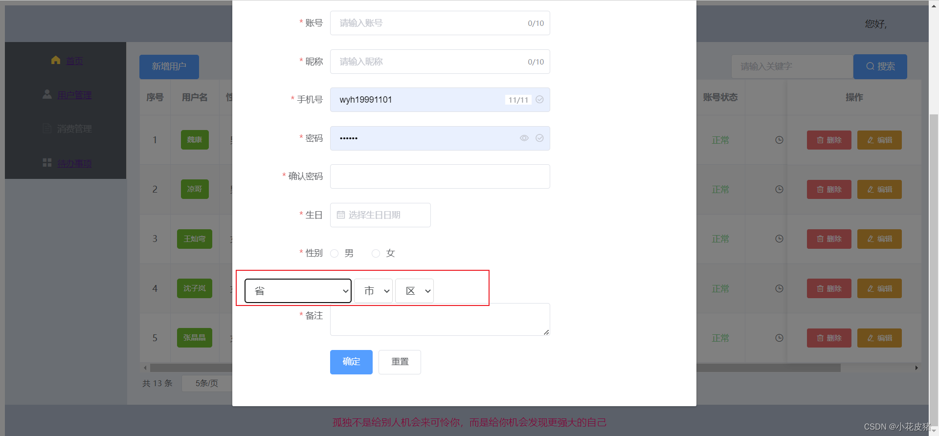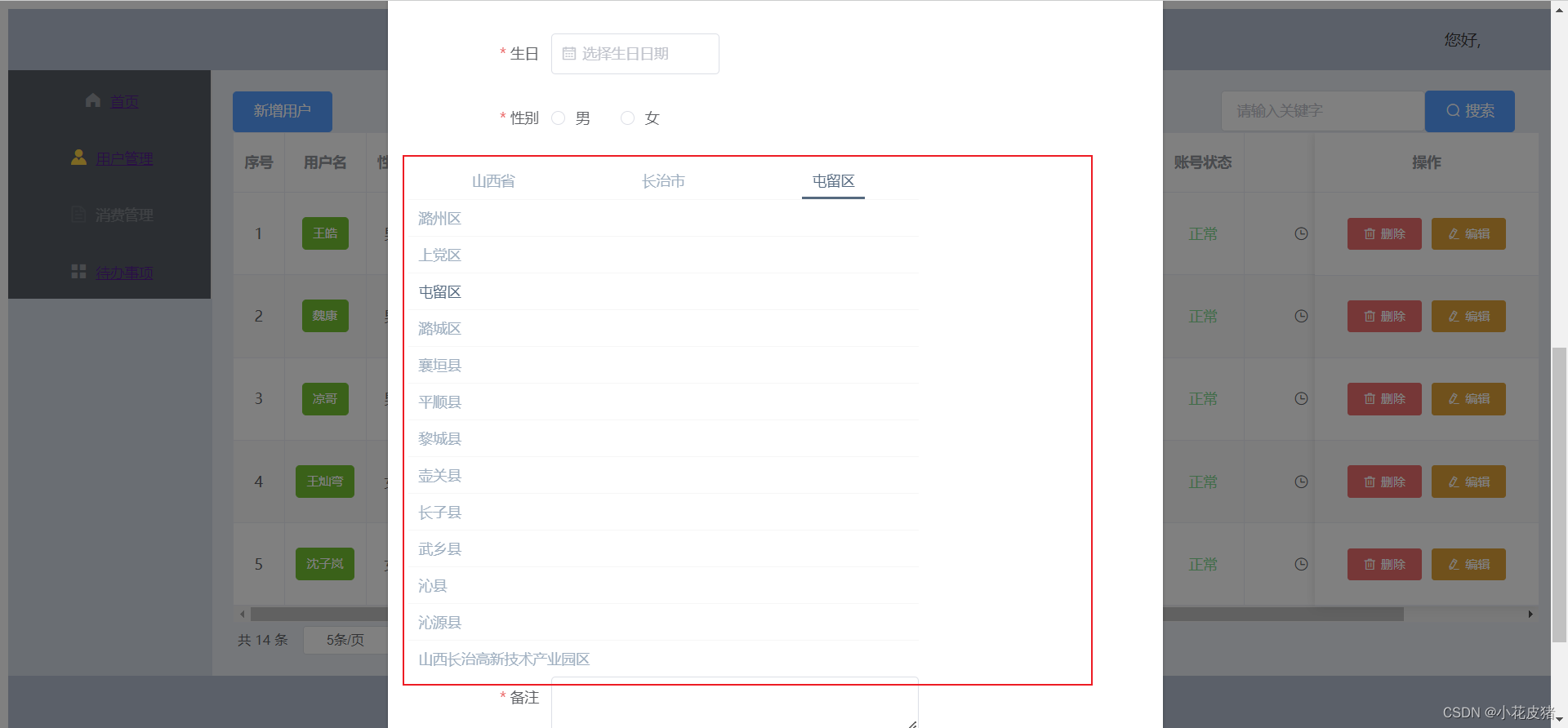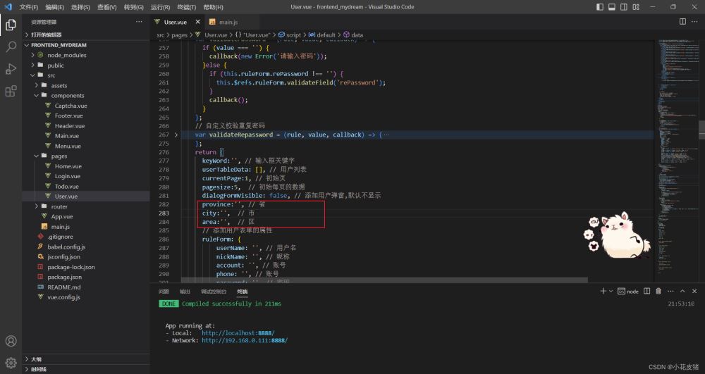 然后在data中聲明省市區這三個變量,用于接收下拉框省市區的值