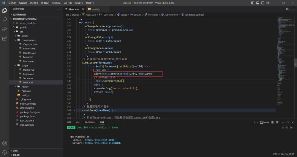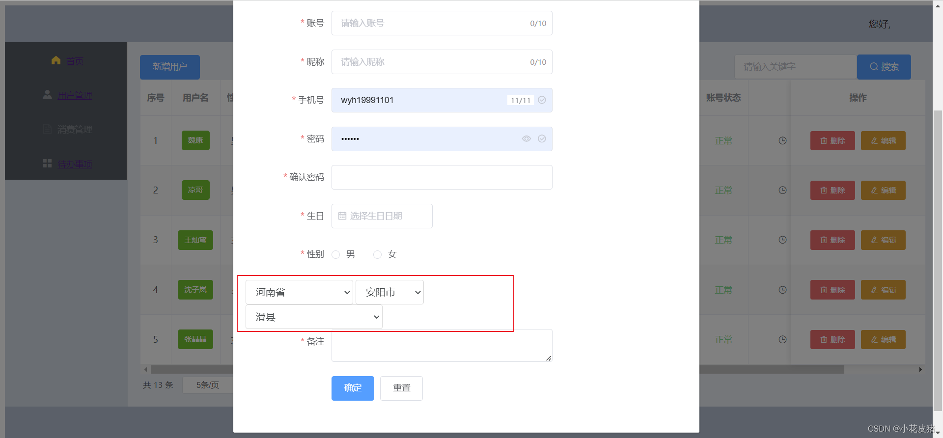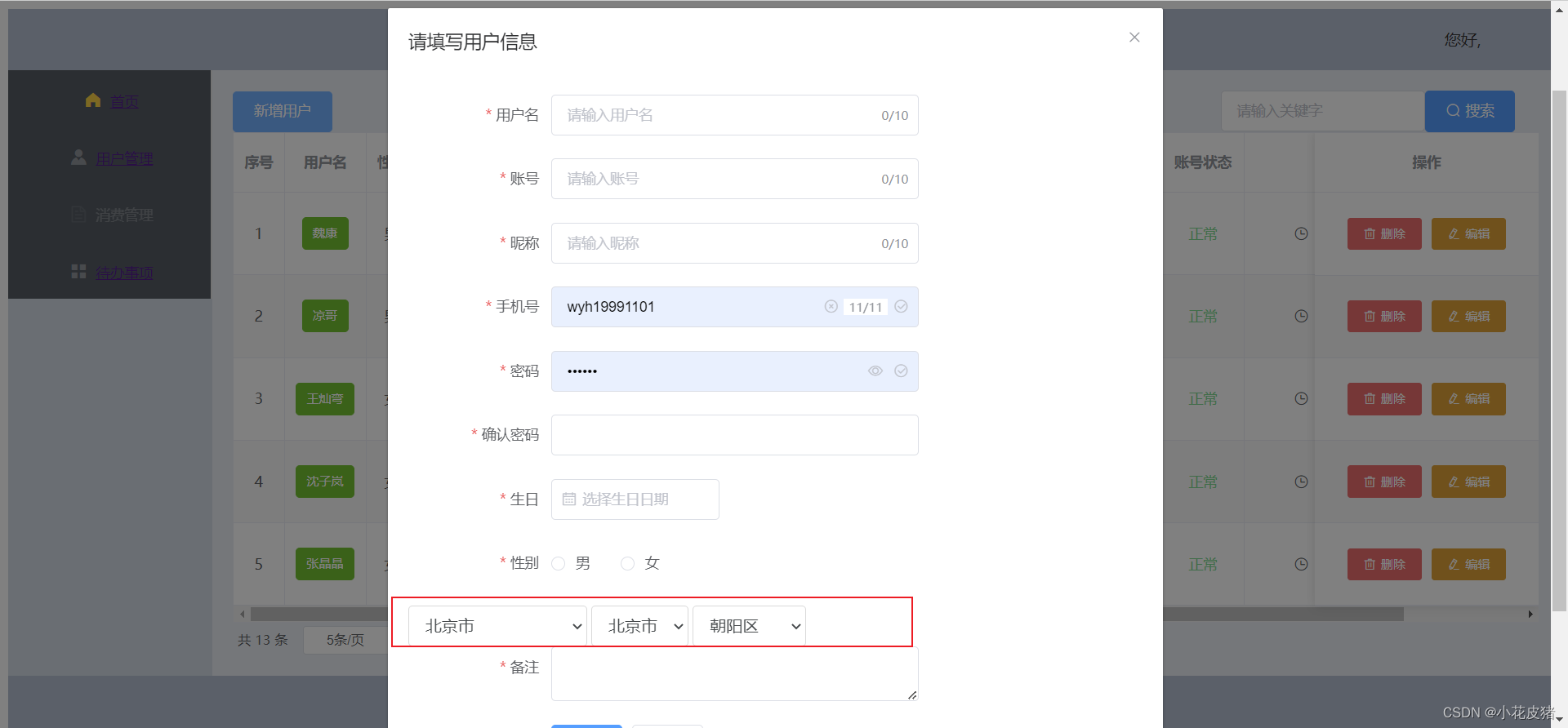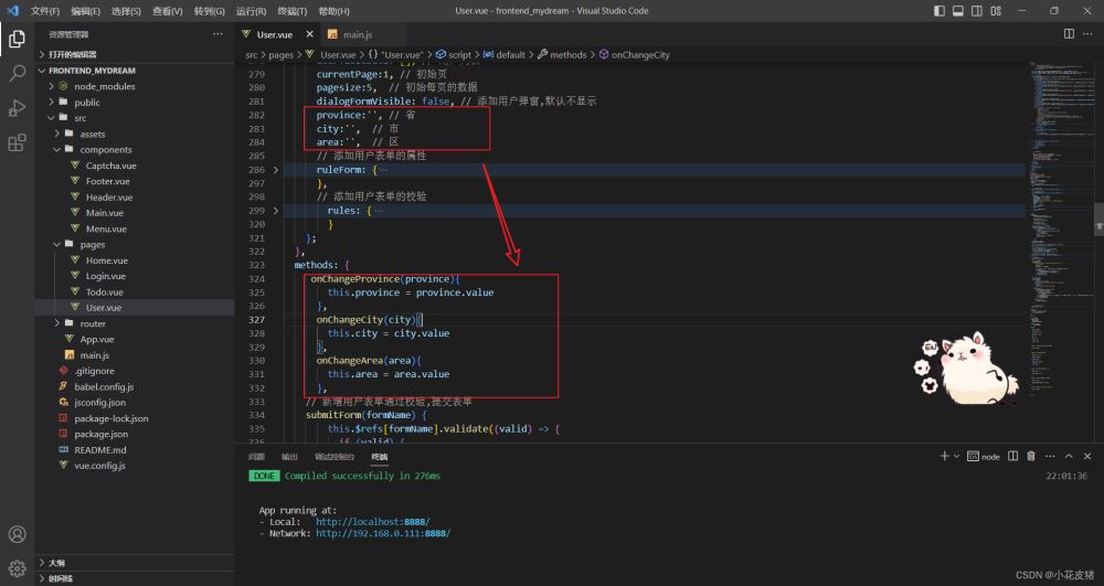 然后在data中聲明省市區這三個變量,用于接收下拉框省市區的值