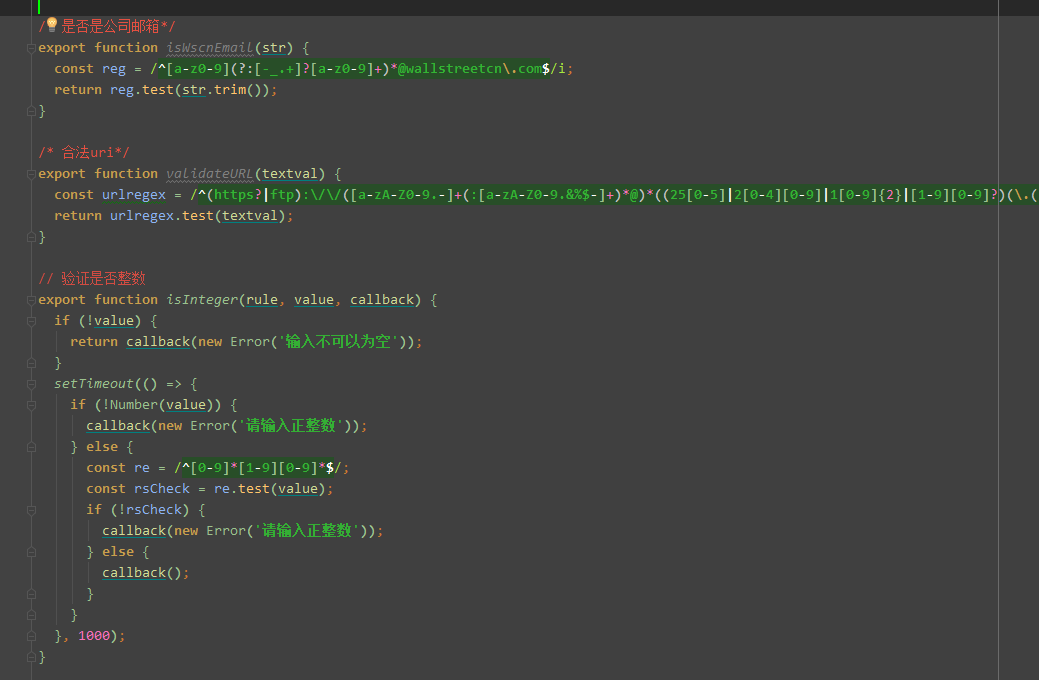 1、是否合法IP地址export function validateIP(rule, value,callback) { if(value==""||value==undefined||value==null){ callback(); }else { const reg = /^(\d{1,2}|1\d\d|2[0-4]\d|25[0-5])\.(\d{1,2}|1\d\d|2[0-4]\d|25[0-5])\.(\d{1,2}|1\d\d|2[0-4]\d|25[0-5])\.(\d{1,2}|1\d\d|2[0-4]\d|25[0-5])$/; if ((!reg.test(value)) && value != "") { callback(new Error("請(qǐng)輸入正確的IP地址")); } else { callback(); } }} 2、是否手機(jī)號(hào)碼或者固話export function validatePhoneTwo(rule, value, callback) { const reg = /^((0\d{2,3}-\d{7,8})|(1[34578]\d{9}))$/;; if (value == "" || value == undefined || value == null) { callback(); } else { if ((!reg.test(value)) && value != "") { callback(new Error("請(qǐng)輸入正確的電話號(hào)碼或者固話號(hào)碼")); } else { callback(); } }} 3、是否固話export function validateTelphone(rule, value,callback) { const reg =/0\d{2,3}-\d{7,8}/; if(value==""||value==undefined||value==null){ callback(); }else { if ((!reg.test(value)) && value != "") { callback(new Error("請(qǐng)輸入正確的固定電話)")); } else { callback(); } }} 4、是否手機(jī)號(hào)碼export function validatePhone(rule, value,callback) { const reg =/^[1][3-9][0-9]{9}$/; if(value==""||value==undefined||value==null){ callback(); }else { if ((!reg.test(value)) && value != "") { callback(new Error("請(qǐng)輸入正確的電話號(hào)碼")); } else { callback(); } }}5、是否身份證號(hào)碼export function validateIdNo(rule, value,callback) { const reg = /(^\d{15}$)|(^\d{18}$)|(^\d{17}(\d|X|x)$)/; if(value==""||value==undefined||value==null){ callback(); }else { if ((!reg.test(value)) && value != "") { callback(new Error("請(qǐng)輸入正確的身份證號(hào)碼")); } else { callback(); } }} 6、是否郵箱export function validateEMail(rule, value,callback) { const reg =/^([a-zA-Z0-9]+[-_\.]?)+@[a-zA-Z0-9]+\.[a-z]+$/; if(value==""||value==undefined||value==null){ callback(); }else{ if (!reg.test(value)){ callback(new Error("請(qǐng)輸入正確的郵箱")); } else { callback(); } }} 7、合法urlexport function validateURL(url) { const urlregex = /^(https?|ftp):\/\/([a-zA-Z0-9.-]+(:[a-zA-Z0-9.&%$-]+)*@)*((25[0-5]|2[0-4][0-9]|1[0-9]{2}|[1-9][0-9]?)(\.(25[0-5]|2[0-4][0-9]|1[0-9]{2}|[1-9]?[0-9])){3}|([a-zA-Z0-9-]+\.)*[a-zA-Z0-9-]+\.(com|edu|gov|int|mil|net|org|biz|arpa|info|name|pro|aero|coop|museum|[a-zA-Z]{2}))(:[0-9]+)*(\/($|[a-zA-Z0-9.,?"\\+&%$#=~_-]+))*$/; return urlregex.test(url);} 8、驗(yàn)證內(nèi)容是否包含英文數(shù)字以及下劃線export function isPassword(rule, value, callback) { const reg =/^[_a-zA-Z0-9]+$/; if(value==""||value==undefined||value==null){ callback(); } else { if (!reg.test(value)){ callback(new Error("僅由英文字母,數(shù)字以及下劃線組成")); } else { callback(); } }} 9、自動(dòng)檢驗(yàn)數(shù)值的范圍export function checkMax20000(rule, value, callback) { if (value == "" || value == undefined || value == null) { callback(); } else if (!Number(value)) { callback(new Error("請(qǐng)輸入[1,20000]之間的數(shù)字")); } else if (value < 1 || value > 20000) { callback(new Error("請(qǐng)輸入[1,20000]之間的數(shù)字")); } else { callback(); }} 10、驗(yàn)證數(shù)字輸入框最大數(shù)值export function checkMaxVal(rule, value,callback) { if (value < 0 || value > 最大值) { callback(new Error("請(qǐng)輸入[0,最大值]之間的數(shù)字")); } else { callback(); }} 11、驗(yàn)證是否1-99之間export function isOneToNinetyNine(rule, value, callback) { if (!value) { return callback(new Error("輸入不可以為空")); } setTimeout(() => { if (!Number(value)) { callback(new Error("請(qǐng)輸入正整數(shù)")); } else { const re = /^[1-9][0-9]{0,1}$/; const rsCheck = re.test(value); if (!rsCheck) {callback(new Error("請(qǐng)輸入正整數(shù),值為【1,99】")); } else {callback(); } } }, 0);} 12、驗(yàn)證是否整數(shù)export function isInteger(rule, value, callback) { if (!value) { return callback(new Error("輸入不可以為空")); } setTimeout(() => { if (!Number(value)) { callback(new Error("請(qǐng)輸入正整數(shù)")); } else { const re = /^[0-9]*[1-9][0-9]*$/; const rsCheck = re.test(value); if (!rsCheck) {callback(new Error("請(qǐng)輸入正整數(shù)")); } else {callback(); } } }, 0);} 13、驗(yàn)證是否整數(shù),非必填export function isIntegerNotMust(rule, value, callback) { if (!value) { callback(); } setTimeout(() => { if (!Number(value)) { callback(new Error("請(qǐng)輸入正整數(shù)")); } else { const re = /^[0-9]*[1-9][0-9]*$/; const rsCheck = re.test(value); if (!rsCheck) {callback(new Error("請(qǐng)輸入正整數(shù)")); } else {callback(); } } }, 1000);} 14、 驗(yàn)證是否是[0-1]的小數(shù)export function isDecimal(rule, value, callback) { if (!value) { return callback(new Error("輸入不可以為空")); } setTimeout(() => { if (!Number(value)) { callback(new Error("請(qǐng)輸入[0,1]之間的數(shù)字")); } else { if (value < 0 || value > 1) {callback(new Error("請(qǐng)輸入[0,1]之間的數(shù)字")); } else {callback(); } } }, 100);} 15、 驗(yàn)證是否是[1-10]的小數(shù),即不可以等于0export function isBtnOneToTen(rule, value, callback) { if (typeof value == "undefined") { return callback(new Error("輸入不可以為空")); } setTimeout(() => { if (!Number(value)) { callback(new Error("請(qǐng)輸入正整數(shù),值為[1,10]")); } else { if (!(value == "1" || value == "2" || value == "3" || value == "4" || value == "5" || value == "6" || value == "7" || value == "8" || value == "9" || value == "10")) {callback(new Error("請(qǐng)輸入正整數(shù),值為[1,10]")); } else {callback(); } } }, 100);} 16、驗(yàn)證是否是[1-100]的小數(shù),即不可以等于0export function isBtnOneToHundred(rule, value, callback) { if (!value) { return callback(new Error("輸入不可以為空")); } setTi