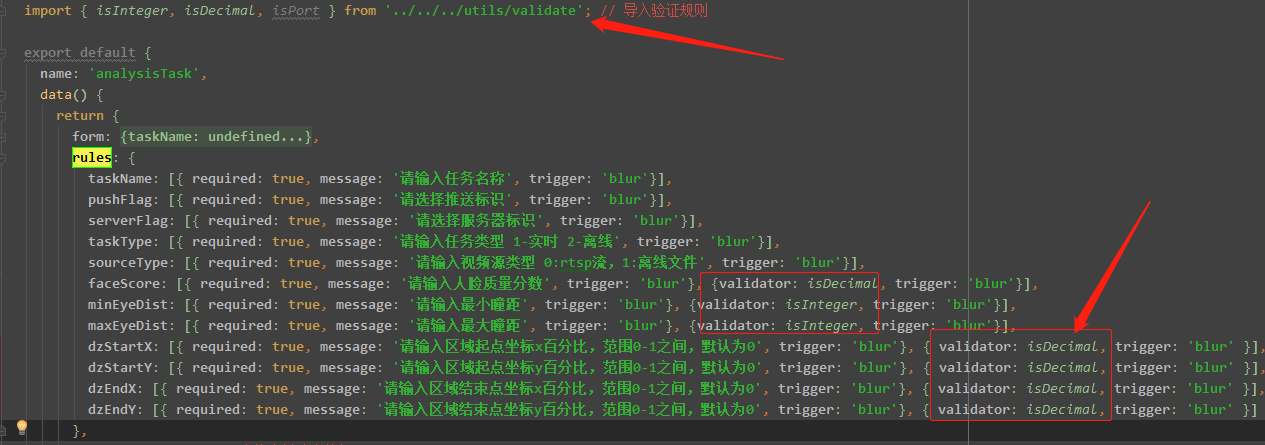 然后在頁(yè)面(index.vue)中引入驗(yàn)證規(guī)則定義的文件,并在export default中定義rule規(guī)則