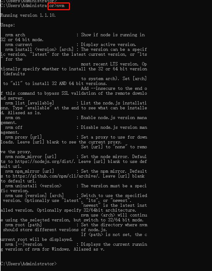 (8)以管理員權限打開cmd,然后執行nvm,如下出現幫助信息,表示nvm安裝成功