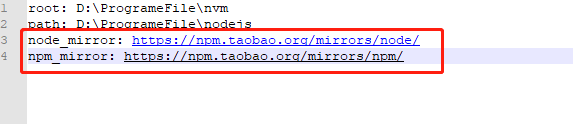 - nvm node_mirror [url] :設置node鏡像。默認是https://nodejs.org/dist/。如果不寫url,則使用默認url。設置后可至安裝目錄settings.txt文件查看,也可直接在該文件操作。