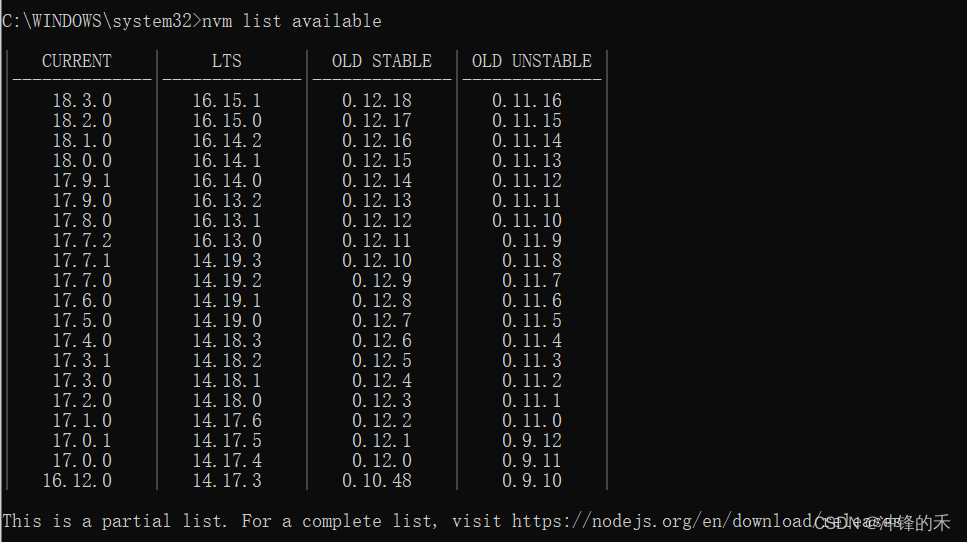 - nvm list [available] :顯示已安裝的列表??蛇x參數available,顯示可安裝的所有版本。list可簡化為ls。