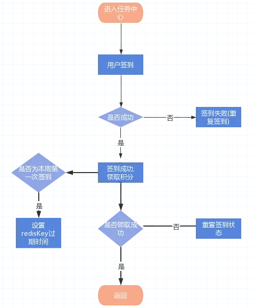 需求以自然周為周期進(jìn)行簽到;展示簽到周期;重復(fù)簽到提示報(bào)錯(cuò);流程圖