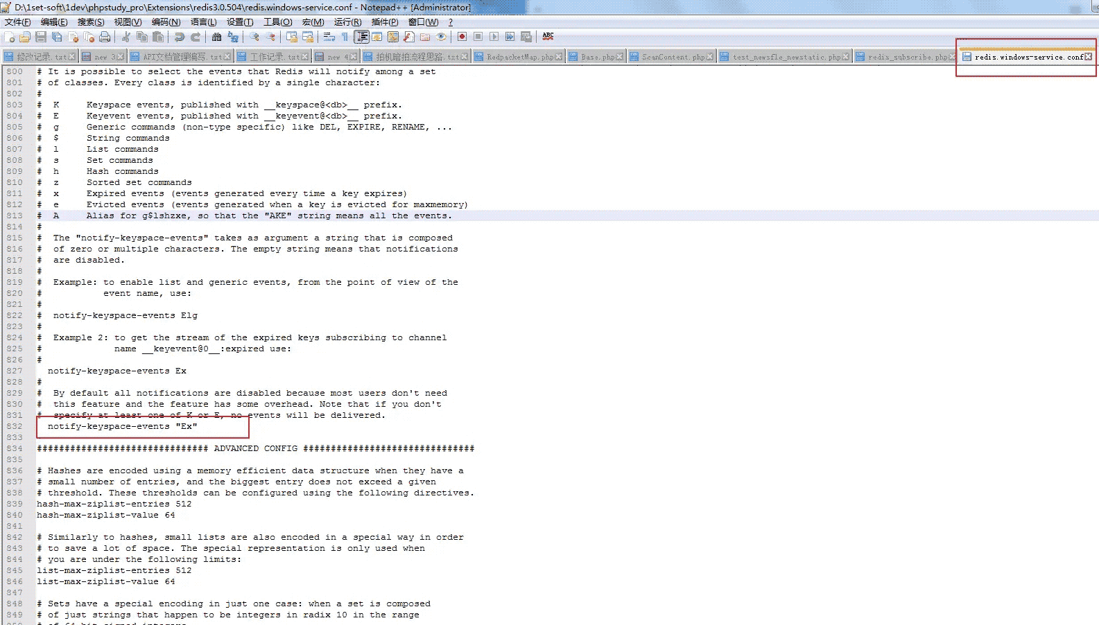 (2). windows平臺打開Redis安裝目錄中找到"redis.windows-service.conf",然后打開編輯找到notify-keyspace-events那一行,去掉"#",改為notify-keyspace-events “Ex"。