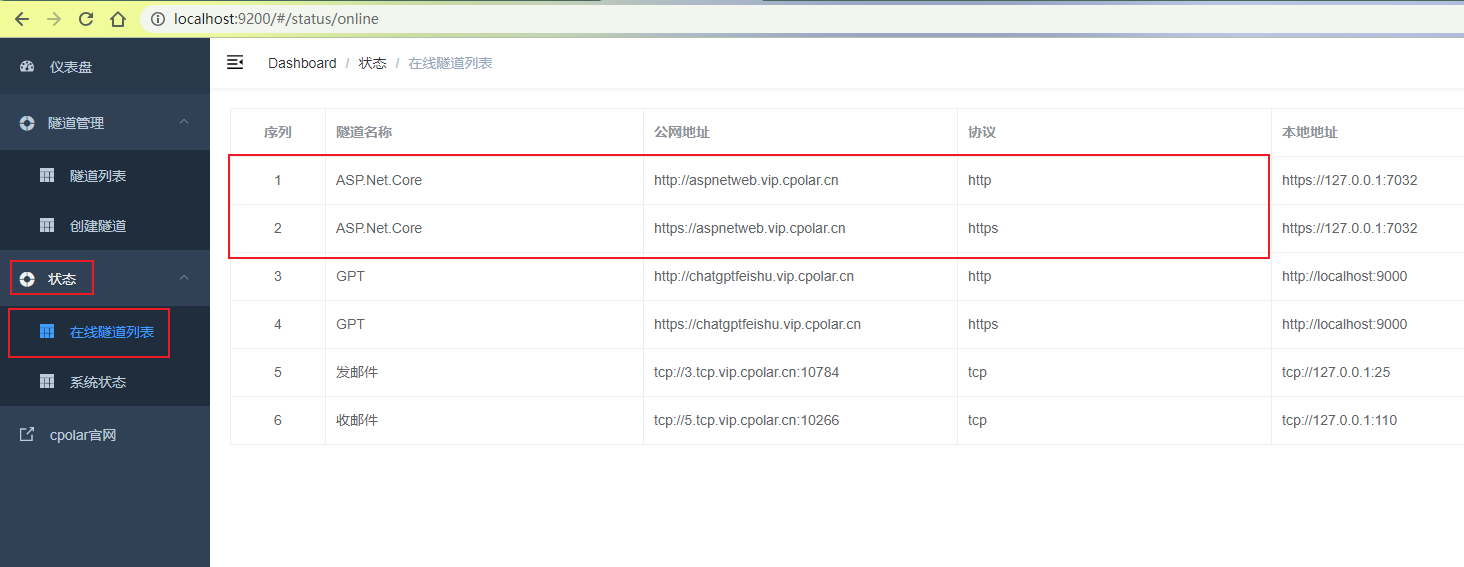 隧道創(chuàng)建成功后,點擊左側(cè)的狀態(tài)——在線隧道列表,查看所生成的公網(wǎng)地址,有兩種訪問方式,一種是http 和https