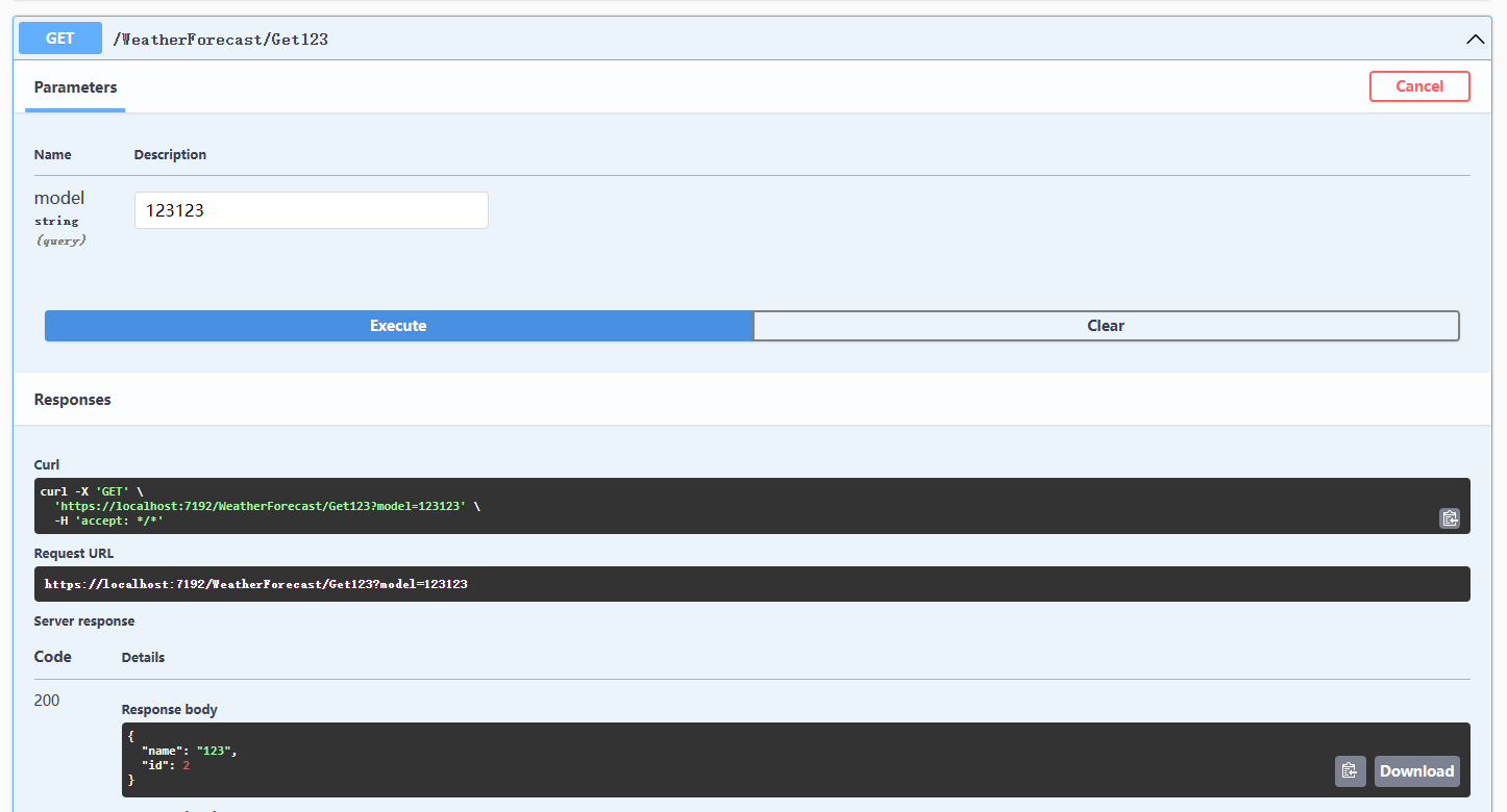 [HttpGet]public dynamic Get123(string model){ return new { name = '123', id = 2 };}