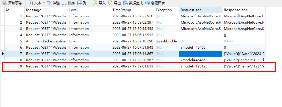 Message:日志信息Level:等級(jí)TimeStamp:記錄日志時(shí)間Exception:異常信息RequestJson:請(qǐng)求參數(shù)jsonResponseJson:響應(yīng)結(jié)果json其中前面四種為日志默認(rèn),后兩種為我主動(dòng)添加,在實(shí)際的設(shè)計(jì)中還有可能有不同的信息,如: