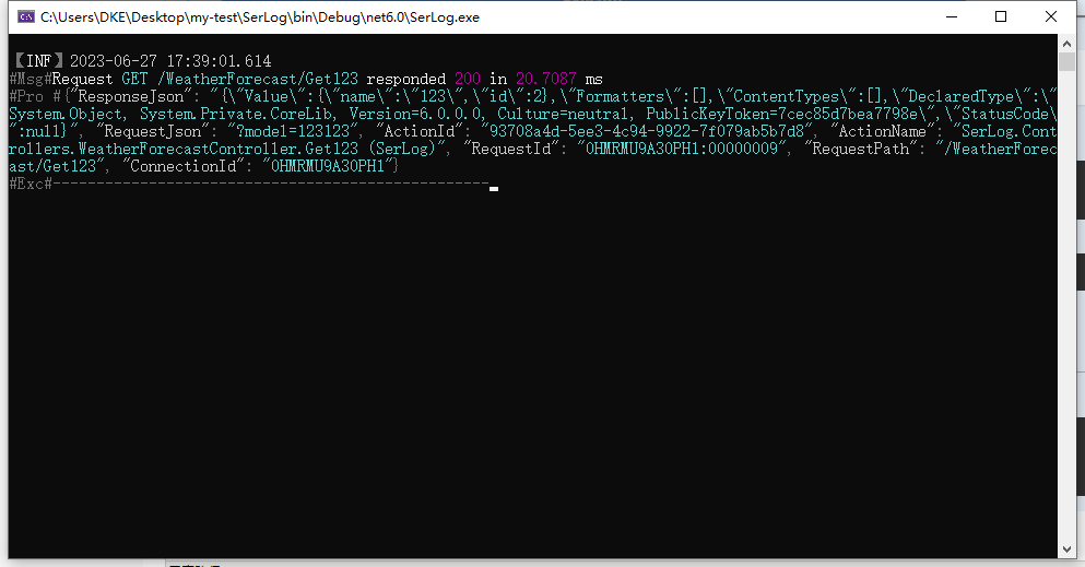 var builder = WebApplication.CreateBuilder(args);// Add services to the container.builder.Services.AddControllers(options =>{ options.Filters.Add(typeof(RequestLoggingFilter));});// Learn more about configuring Swagger/OpenAPI at https://aka.ms/aspnetcore/swashbucklebuilder.Services.AddEndpointsApiExplorer();builder.Services.AddSwaggerGen();builder.Host.AddSerilLog();var app = builder.Build();// Configure the HTTP request pipeline.if (app.Environment.IsDevelopment()){ app.UseSwagger(); app.UseSwaggerUI();}app.UseHttpsRedirection();app.UseAuthorization();app.MapControllers();app.Run();這里我設(shè)計(jì)的日志信息只包括了