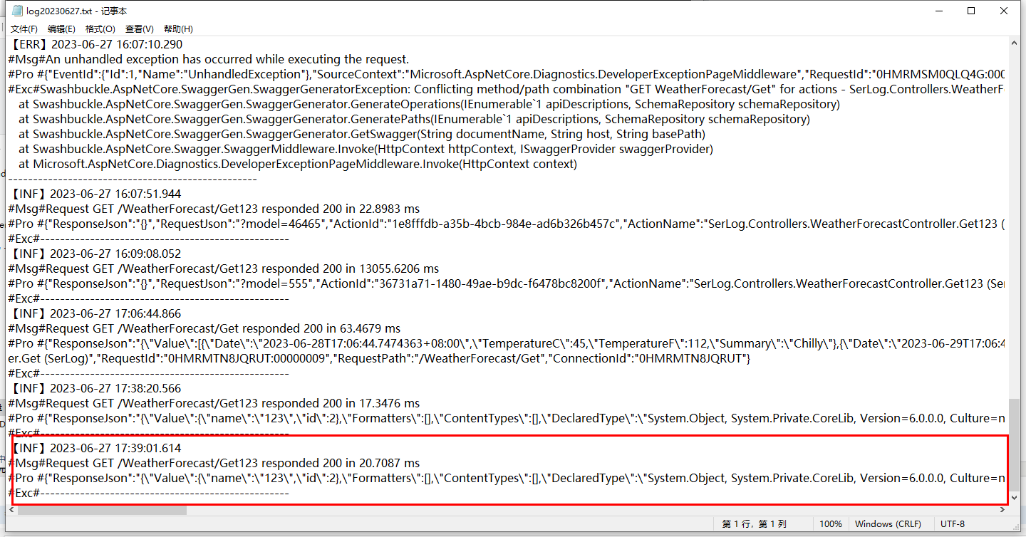 builder.Services.AddControllers(options =>{ options.Filters.Add(typeof(RequestLoggingFilter));});// Learn more about configuring Swagger/OpenAPI at https://aka.ms/aspnetcore/swashbucklebuilder.Services.AddEndpointsApiExplorer();builder.Services.AddSwaggerGen();builder.Host.AddSerilLog();var app = builder.Build();// Configure the HTTP request pipeline.if (app.Environment.IsDevelopment()){ app.UseSwagger(); app.UseSwaggerUI();}app.UseHttpsRedirection();app.UseAuthorization();app.MapControllers();app.Run();測(cè)試效果在控制器添加一個(gè)測(cè)試方法并將其調(diào)用一次