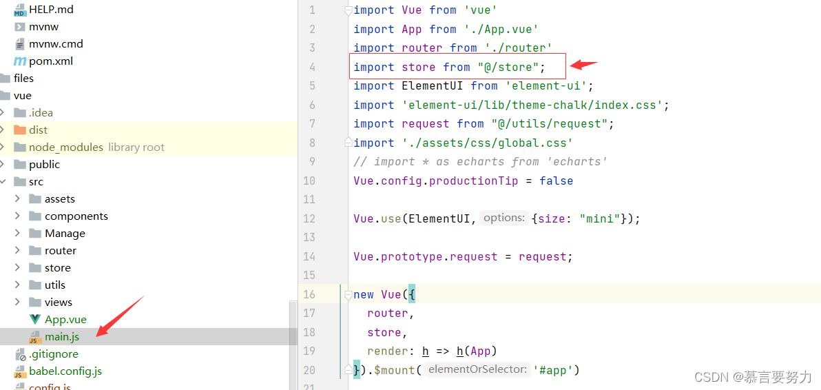 import Vue from "vue"import Vuex from "vuex" Vue.use(Vuex) const store = new Vuex.Store({ state: { currentPathName: "" }, mutations: { setPath (state) { state.currentPathName = localStorage.getItem("currentPathName") } }}) export default store 3.main.js