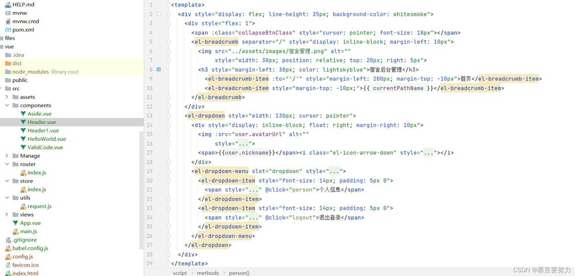 <template> <div> <div> <span :class="collapseBtnClass"></span> <el-breadcrumb separator="/"><img src="../assets/images/宿舍管理.png" ><h3>宿舍后臺(tái)管理</h3> <el-breadcrumb-item :to=""/"">首頁(yè)</el-breadcrumb-item> <el-breadcrumb-item>{{ currentPathName }}</el-breadcrumb-item> </el-breadcrumb> </div> <el-dropdown> <div><img :src="user.avatarUrl" ><span>{{user.nickname}}</span><i></i> </div> <el-dropdown-menu slot="dropdown"><el-dropdown-item> <span @click="person">個(gè)人信息</span></el-dropdown-item><el-dropdown-item> <span @click="logout">退出登錄</span></el-dropdown-item> </el-dropdown-menu> </el-dropdown> </div></template> <script>export default { name: "Header", props: { collapseBtnClass: String, user: Object }, computed: { currentPathName () { return this.$store.state.currentPathName; //需要監(jiān)聽的數(shù)據(jù) } }, data() { return { user: localStorage.getItem("user") ? JSON.parse(localStorage.getItem("user")) : {} } }, methods: { logout() { this.$router.push("/login") this.$message.success("退出成功") }, person(){ this.$router.push("/mall/person") } }}</script> <style scoped> </style>?小結(jié)