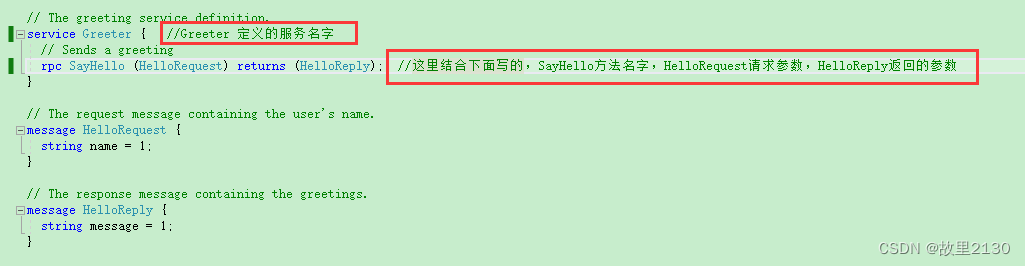 這里結合下面寫的,SayHello方法名字,HelloRequest請求參數,HelloReply返回的參數