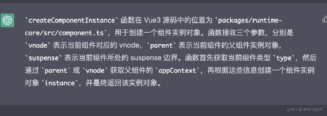 const mountComponent: MountComponentFn = (...args) => { const instance: ComponentInternalInstance = compatMountInstance || (initialVNode.component = createComponentInstance(initialVNode,parentComponent,parentSuspense )) // ... 省略代碼 // resolve props and slots for setup context if (!(__COMPAT__ && compatMountInstance)) {// ...這里調用了setupComponent,傳入了實例,還寫了注釋,感人 setupComponent(instance) } // setupRenderEffect 居然也在這 setupRenderEffect( instance, initialVNode, container, anchor, parentSuspense, isSVG, optimized ) }mountComponent函數先調用了createComponentInstance, 返回個組件實例,又把實例當作參數傳給了 setupComponent。順便我們還在這發現了 ChatGPT 搞丟的setupRenderEffect函數,它是用來處理一些渲染副作用的。