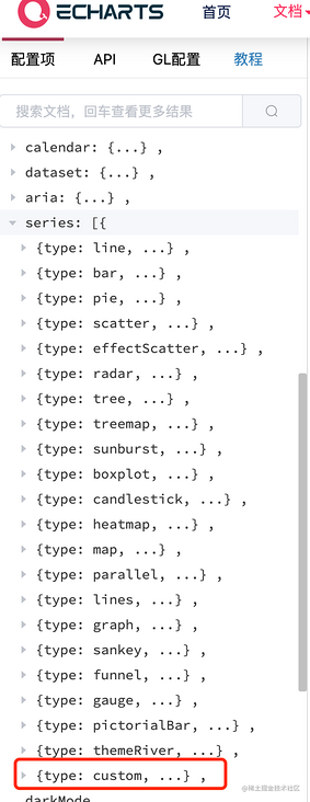 那我們看所有的type 沒有立體柱狀圖的類型,但是呢我們看最后一項type: custom,什么意思呢,自定義系列,那就是說我們可以選擇custom 類型來實現立體柱狀圖