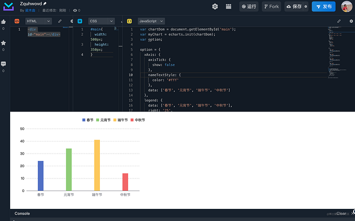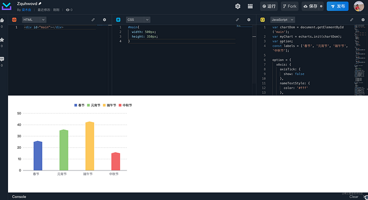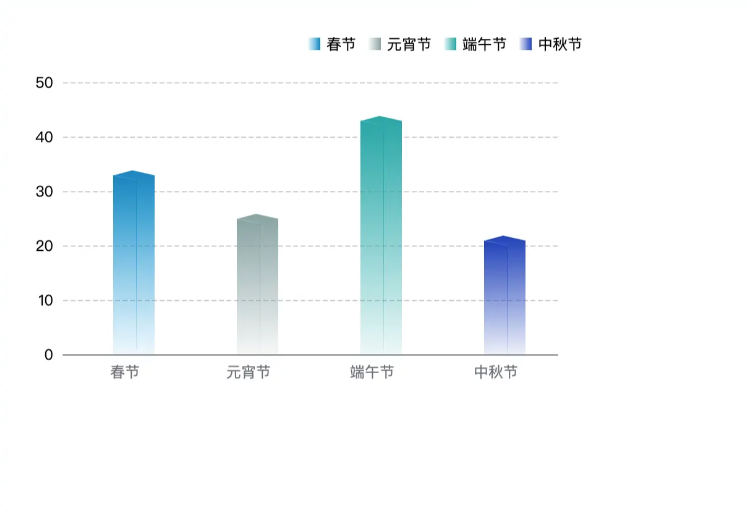 <div id="main"></div>?#main{  width: 500px;  height: 350px;}?var chartDom = document.getElementById("main");var myChart = echarts.init(chartDom);var option;?option = {  xAxis: {    axisTick: {      show: false    },    nameTextStyle: {      color: "#fff"    },    data: ["春節", "元宵節", "端午節", "中秋節"]  },  legend: {    data: ["春節", "元宵節", "端午節", "中秋節"],    right: "25",    top: "18",    icon: "rect",    itemHeight: 10,    itemWidth: 10,    textStyle: {      color: "#000"    }  },  yAxis: {    type: "value",    axisLabel: {      color: "#000"    },    splitLine: {      show: true,      lineStyle: {type: "dashed",color: ["#ccc"]      }    }  },  series: [    {      data: [{ name: "春節", value: 24 },{ name: "端午節", value: 44 },{ name: "中秋節", value: 32 },{ name: "春節", value: 50 }      ],      barWidth: 30,      type: "bar"    }  ]};??option && myChart.setOption(option);