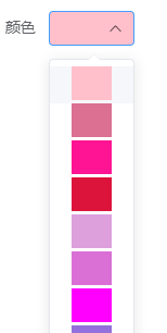 data(){ //顏色初始數據 colorList: ["#FFC0CB", "#DB7093", "#FF1493", "#DC143C", "#DDA0DD", "#DA70D6", "#FF00FF", "#9370DB", "#800080", "#6495ED", "#4169E1", "#0000FF", "#87CEEB", "#E1FFFF", "#00FFFF", "#7FFFAA", "#00FF7F", "#008000", "#FFFFE0", "#FFFF00", "#FFD700", "#F5DEB3", "#FFA500", "#CD5C5C"], //可設置默認值 color:"#FFC0CB"}使用