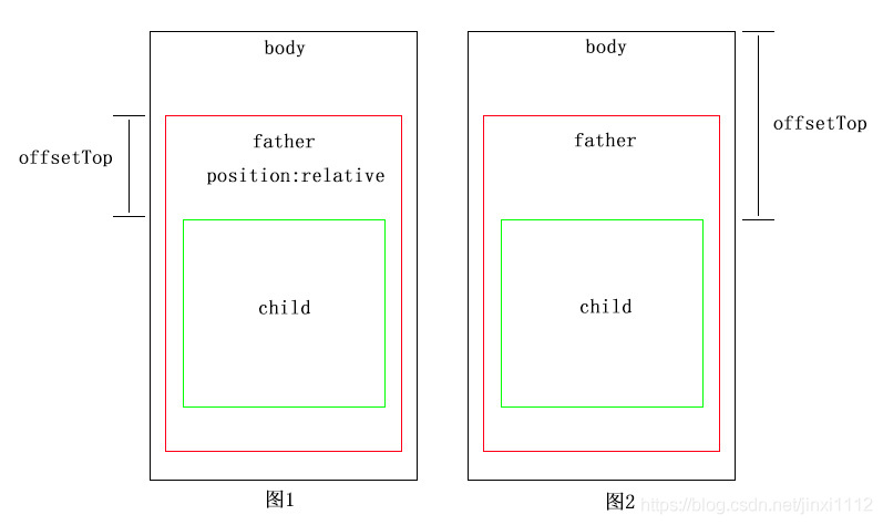 2. offsetParent:距離元素最近的一個(gè)具有定位的祖宗元素(relative,absolute,fixed),若祖宗都不符合條件,offsetParent為body。如下圖所示:獲取child的offsetTop,圖1的offsetParent為father,圖2的offsetParent為body。