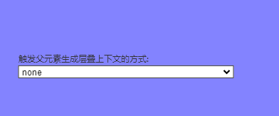 h1 { position: absolute; top: 50%; left: 50%; transform: translate(-50%, -50%); z-index: 999; height: 10vh; line-height: 10vh; color: #333; font-size: 1.5vw;}select { height: 10vh; line-height: 10vh; font-size: 1vw; outline: none; border: 1px solid #333;}.container { width:10vw; height: 10vw; // transform: translate3d(5vw, 5vw, 0); // will-change: transform; background: rgba(255, 100, 100, .8);}.fixed { position: fixed; top: 1vw; left: 1vw; right: 1vw; bottom: 1vw; background: rgba(100, 100, 255, .8);}.g-absolute { position: absolute; z-index: 10;}.g-flex { display: flex; z-index: 10;}.g-opacity { opacity: .5;}.g-transform { transform: translate3d(0, 0, 0); // transform: scale(1);}.g-blend { mix-blend-mode: screen;}.g-filter { filter: blur(5px);}.g-perspective { perspective: 1000px;}.g-isolation{ isolation: isolate;}.g-fixed { position: fixed;}.g-willChange { will-change: transform;}.g-scrolling { -webkit-overflow-scrolling: touch;}.g-backface { backface-visibility: hidden;}.g-preserve3d { transform-style: preserve-3d;}.g-contain { contain: paint;}<div> <div> </div></div>