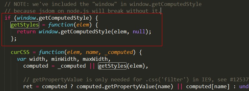 兩者的用法完全一樣,在 jQuery v1.10.2 中,使用的就是window.getComputedStyle 。如下