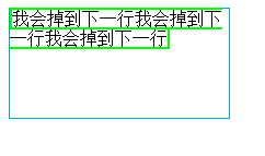 <head><style>div{ width: 200px; height: 100px; border: 1px solid #00A4CC;}span{ border: 2px solid #00ff00;}</style></head><body><div> <span> 我會掉到下一行我會掉到下一行我會掉到下一行</span></div></body>效果顯示如下: