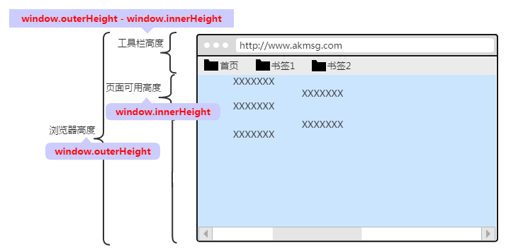 工具欄高/寬度 :包含了地址欄、書簽欄、瀏覽器邊框等范圍。如:高度,可通過瀏覽器高度 - 頁面可用高度得出,即:window.outerHeight - window.innerHeight。