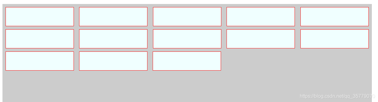 <!DOCTYPE html><html> <head> <meta charset="utf-8"> <title></title> </head> <style type="text/css"> li { list-style: none; } .List { width: 100%; box-sizing: border-box; display: flex; justify-content: space-between; flex-wrap: wrap; padding: 10px; } .List:after{ content: ""; flex: auto; } .item { /* 寬度是固定好的 */ width: 220px; height: 60px; background-color: azure; margin-bottom: 10px; border: 1px solid red; /*這個數值需要自己去調*/ margin-right: 17px; } .item:nth-child(5n){ /* 盡量讓item在list中居中,兩邊都沒有margin */ margin-right: 0; } </style> <body> <div id=""> <ul> <li></li> <li></li> <li></li> <li></li> <li></li> <li></li> <li></li> <li></li> <li></li> <li></li> <li></li> <li></li> <li></li> </ul> </div> </body></html>重要代碼:要加after以及每個item的margin-right
