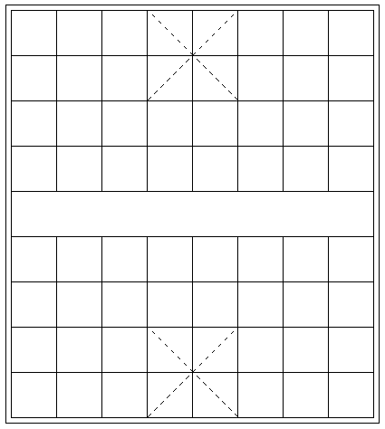 .g-grid { width: 401px; height: 451px; outline: 1px solid #000; outline-offset: 5px; background:// 最上層的白色塊,擋住中間的網(wǎng)格linear-gradient(#fff, #fff),// 實(shí)現(xiàn)網(wǎng)格布局repeating-linear-gradient(#000, #000 1px, transparent 1px, transparent 50px),repeating-linear-gradient(90deg, #000, #000 1px, transparent 1px, transparent 50px),// 棋盤上方的虛線1repeating-linear-gradient(-45deg, transparent 0, transparent 5px, #fff 5px, #fff 10px),linear-gradient(45deg, transparent, transparent calc(50% - 0.5px), #000 calc(50% - 0.5px), #000 calc(50% + 0.5px), transparent calc(50% + 0.5px), transparent 0),// 棋盤上方的虛線2repeating-linear-gradient(45deg, transparent 0, transparent 5px, #fff 5px, #fff 10px),linear-gradient(-45deg, transparent, transparent calc(50% - 0.5px), #000 calc(50% - 0.5px), #000 calc(50% + 0.5px), transparent calc(50% + 0.5px), transparent 0),// 棋盤下方的虛線1repeating-linear-gradient(-45deg, transparent 0, transparent 5px, #fff 5px, #fff 10px),linear-gradient(45deg, transparent, transparent calc(50% - 0.5px), #000 calc(50% - 0.5px), #000 calc(50% + 0.5px), transparent calc(50% + 0.5px), transparent 0),// 棋盤下方的虛線2repeating-linear-gradient(45deg, transparent 0, transparent 5px, #fff 5px, #fff 10px),linear-gradient(-45deg, transparent, transparent calc(50% - 0.5px), #000 calc(50% - 0.5px), #000 calc(50% + 0.5px), transparent calc(50% + 0.5px), transparent 0); background-repeat: no-repeat; background-size: calc(100% - 2px) 49px, 100% 100%, 100% 100%, // 交叉虛線 1100px 100px, 100px 100px, 100px 100px, 100px 100px,// 交叉虛線 2100px 100px, 100px 100px, 100px 100px, 100px 100px; background-position: 1px 201px, 0 0, 0 0, // 交叉虛線 1151px 0, 151px 0, 151px 0, 151px 0,// 交叉虛線 2151px 350px, 151px 350px, 151px 350px, 151px 350px;}嚯,這漸變代碼確實(shí)復(fù)雜了點(diǎn),但是其實(shí)每一塊的作用都是很清晰的,這樣,我們的棋盤就變成了這樣: