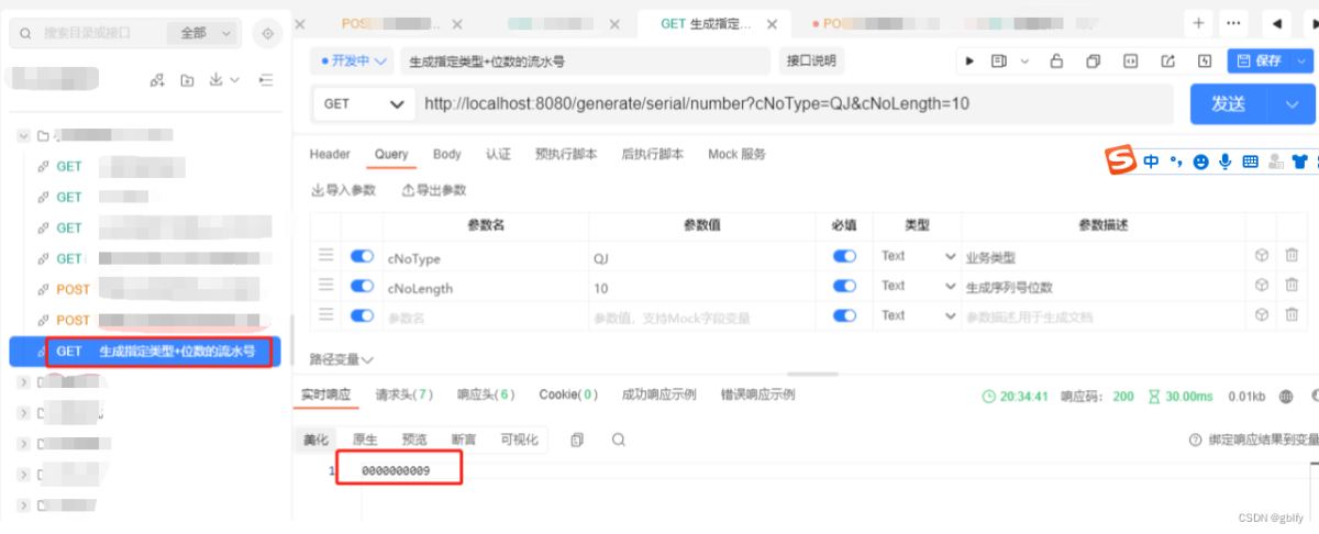 package com.gblfy.business.controller;import com.gblfy.business.service.SysMaxNoService;import org.springframework.beans.factory.annotation.Autowired;import org.springframework.web.bind.annotation.GetMapping;import org.springframework.web.bind.annotation.RequestParam;import org.springframework.web.bind.annotation.RestController;/** * 生成指定類型+位數的流水號 * * @Author gblfy * @Date 2022-05-16 20:13 **/@RestControllerpublic class SysMaxNoController { @Autowired private SysMaxNoService maxNoService; /** * 生成指定類型+位數的流水號 * * @param cNoType * @param cNoLength * @return */ @GetMapping("/generate/serial/number") public String generateSerialNumber(@RequestParam(name = "cNoType", required = false, defaultValue = "cNoType") String cNoType, @RequestParam int cNoLength) {return maxNoService.createMaxNo(cNoType, cNoLength); }}三、測試