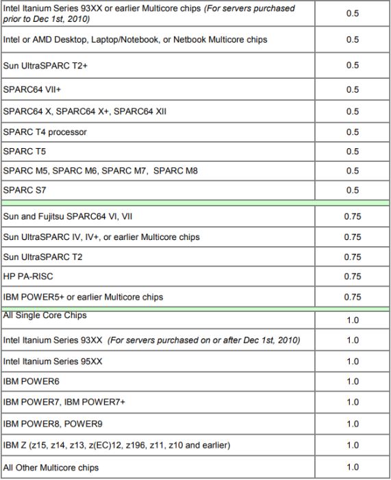 按CPU:License數=CPU 數*系數。系數來自Oracle的一個參數表,如IBM的POWER6、POWER7和POWER8處理器為1,AMD和Intel的處理器為0.5,最新詳細詳細參數表如下: