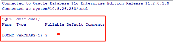 我們來查一下它的表結構,PL/SQL Developer【命令窗口】輸入desc dual;
