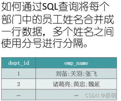 --方法一SELECT d.dept_name,wm_concat(e.emp_name) FROM employee eINNER JOIN department d ON d.dept_id=e.dept_idGROUP BY d.dept_name;