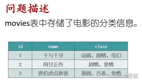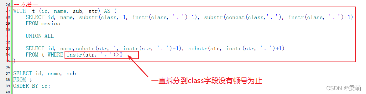 --方法一WITH t (id, name, sub, str) AS ( SELECT id, name, substr(class, 1, instr(class, "、")-1), substr(concat(class,"、"), instr(class, "、")+1) FROM movies UNION ALL SELECT id, name,substr(str, 1, instr(str, "、")-1), substr(str, instr(str, "、")+1) FROM t WHERE instr(str, "、")>0) SELECT id, name, subFROM tORDER BY id;