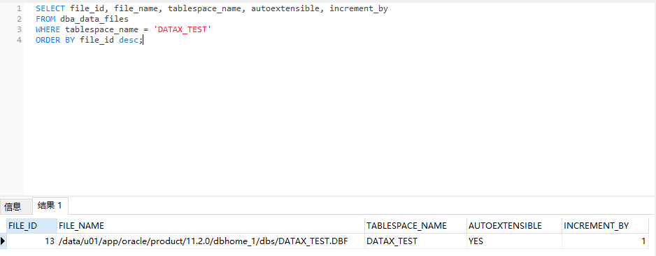 SELECT file_id, file_name, tablespace_name, autoextensible, increment_byFROM dba_data_filesWHERE tablespace_name = "DATAX_TEST"ORDER BY file_id desc;