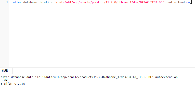 alter database datafile "/data/u01/app/oracle/product/11.2.0/dbhome_1/dbs/DATAX_TEST.DBF" autoextend on;