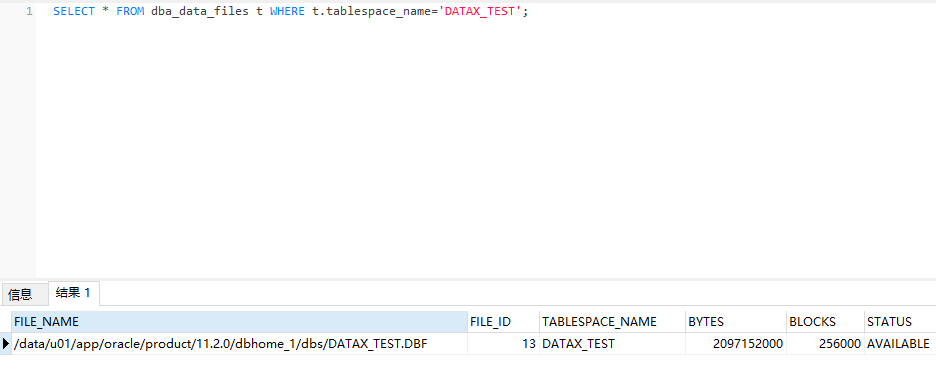 SELECT * FROM dba_data_files t WHERE t.tablespace_name="DATAX_TEST";