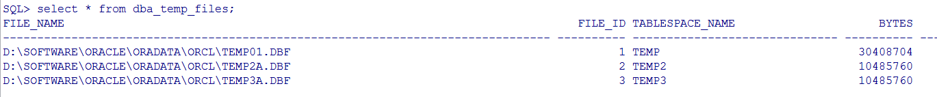 create temporary tablespace temp3 tempfile "D:\software\oracle\oradata\orcl\temp3a.dbf" size 10m autoextend on	tablespace group temp_group ;