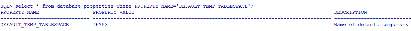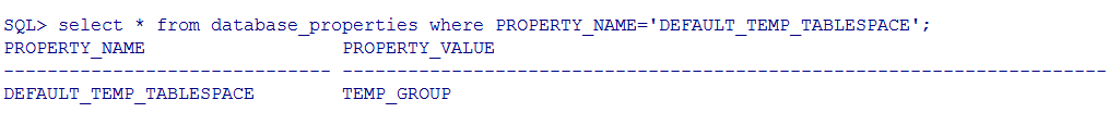 select * from database_properties where PROPERTY_NAME="DEFAULT_TEMP_TABLESPACE";
