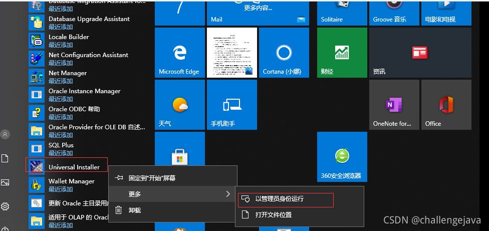 左鍵【開始】找到oracle,注意以管理員身份運行